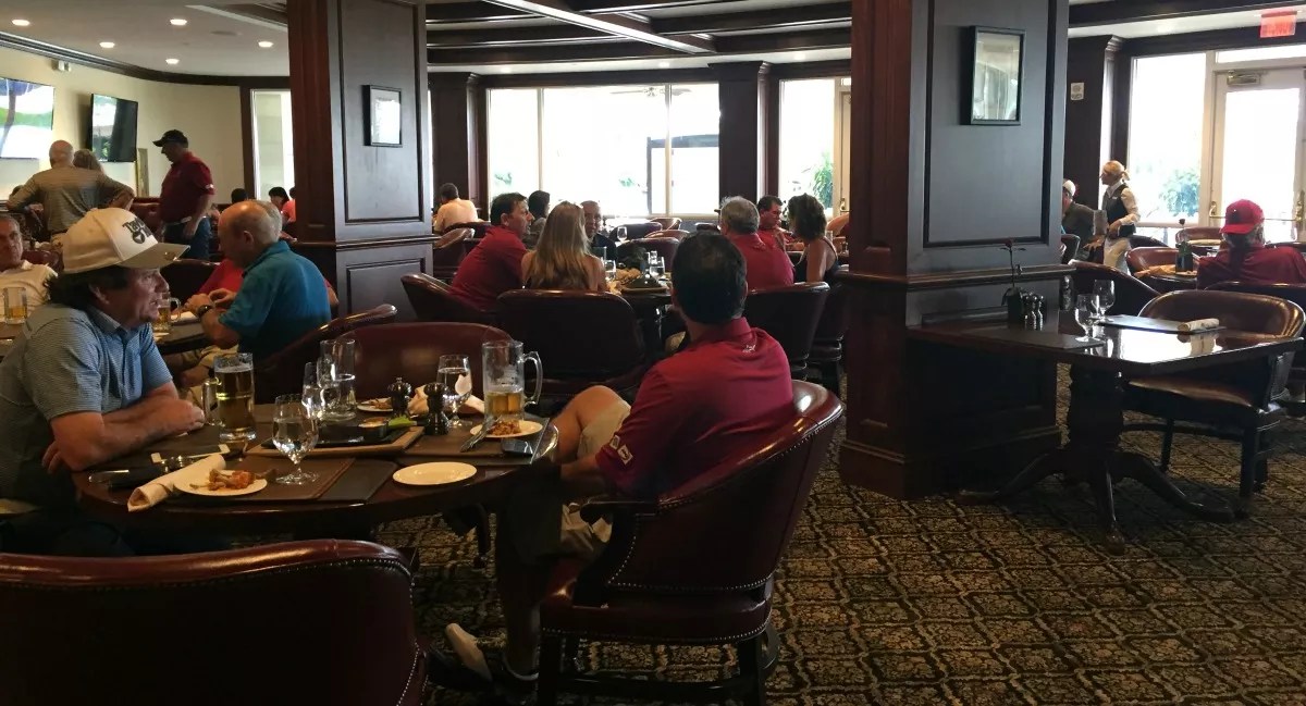 At 2:30 p.m., more than 40 people in matching red polos and khaki shorts sit inside the restaurant. Recalling his most recent meal, Darben says, “We ordered caesar salad and, of course, New York steak.” They’re priced at $14 and $39, respectively.