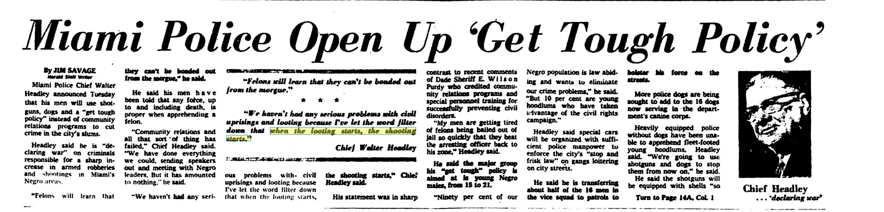 A Miami Herald article from December 1967 said then-Miami Police Chief Walter Headley would arm his officers with shotguns and dogs to “cut crimes in the city’s slums” rather than build a community-relations program.