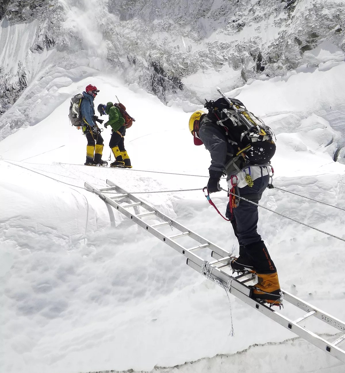 At one point, Santiago felt chunks of snow fall on his head. Looking up, he realized one of the sherpas had fallen and was sliding past him. Sixty feet down, the sherpa caught the rope.