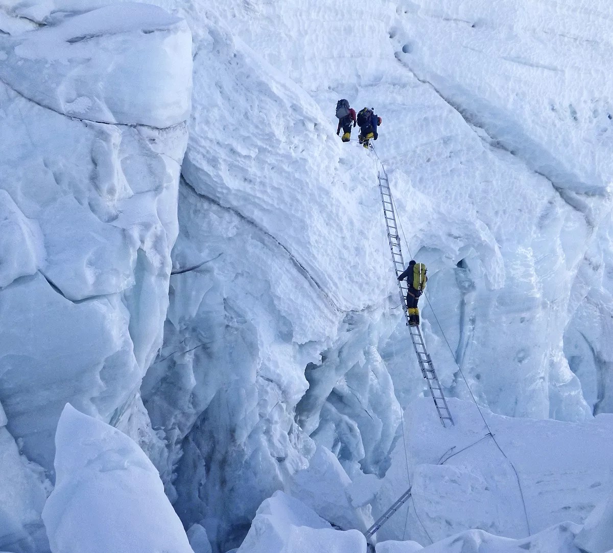 On May 25, the team began its assault on the mountain. Because of the buildup of permits, almost a thousand people were there. Lines formed at the beginning of each icy stretch. At nearly every ladder and ledge, Santiago watched inexperienced climbers teeter across the terrain. Some had never used crampons, he says: “Their first time was on the icefall.”