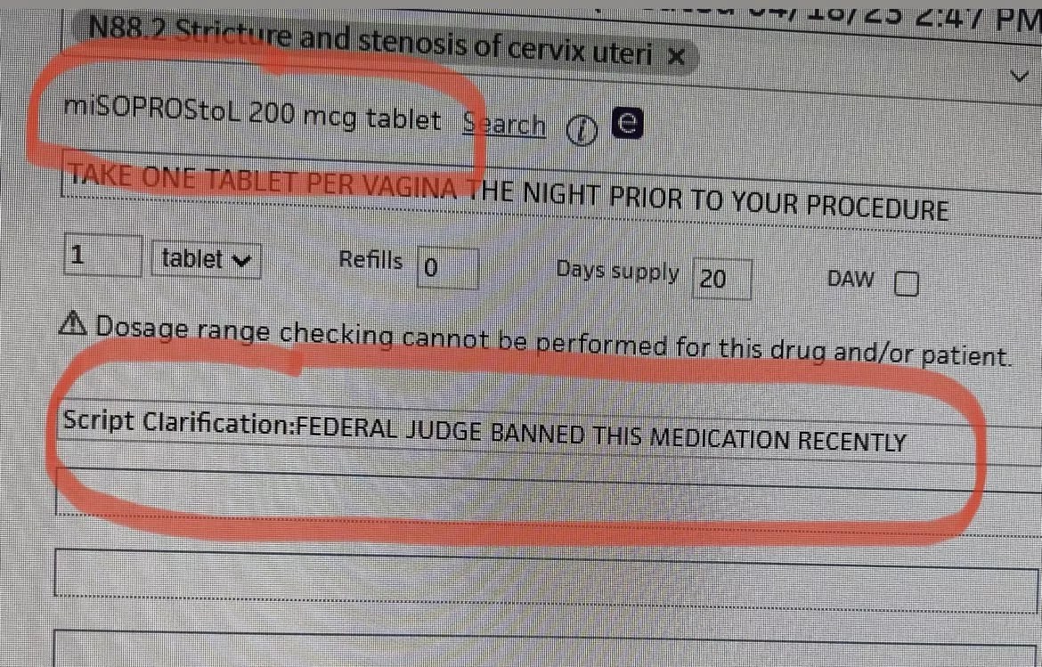 First, and most glaring: The pharmacist’s note almost certainly refers to a pending case in Texas that challenges the U.S. Food and Drug Administration’s (FDA) approval in 2000 of mifepristone, half of a two-drug regimen doctors prescribe to induce so-called medication abortions. A Donald Trump-appointed federal judge revoked approval of mifepristone on April 7, but his order was put on hold, and two weeks later, the U.S. Supreme Court suspended the ruling until the Texas case is resolved.