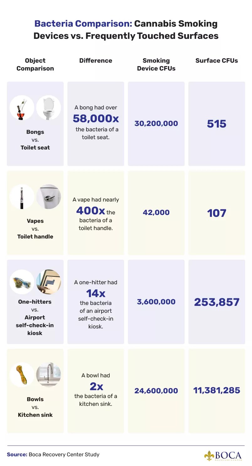 Ah, the simplicity of the one-hitter. Not so fast, says Boca Recovery. The study showed that one-hitters contained 14 times more bacteria than an airport self-check-in kiosk. Your go-to for a quick puff harbors easily enough bacteria to make you sick. Cannabis devices, like bongs and vapes, harbor significantly more bacteria than toilet seats and kitchen sinks.