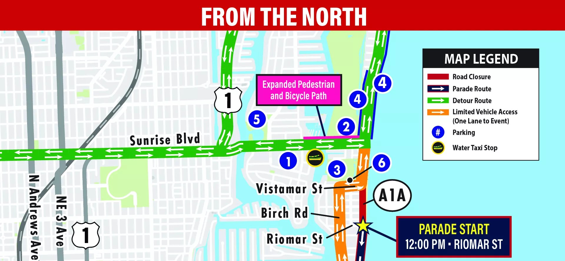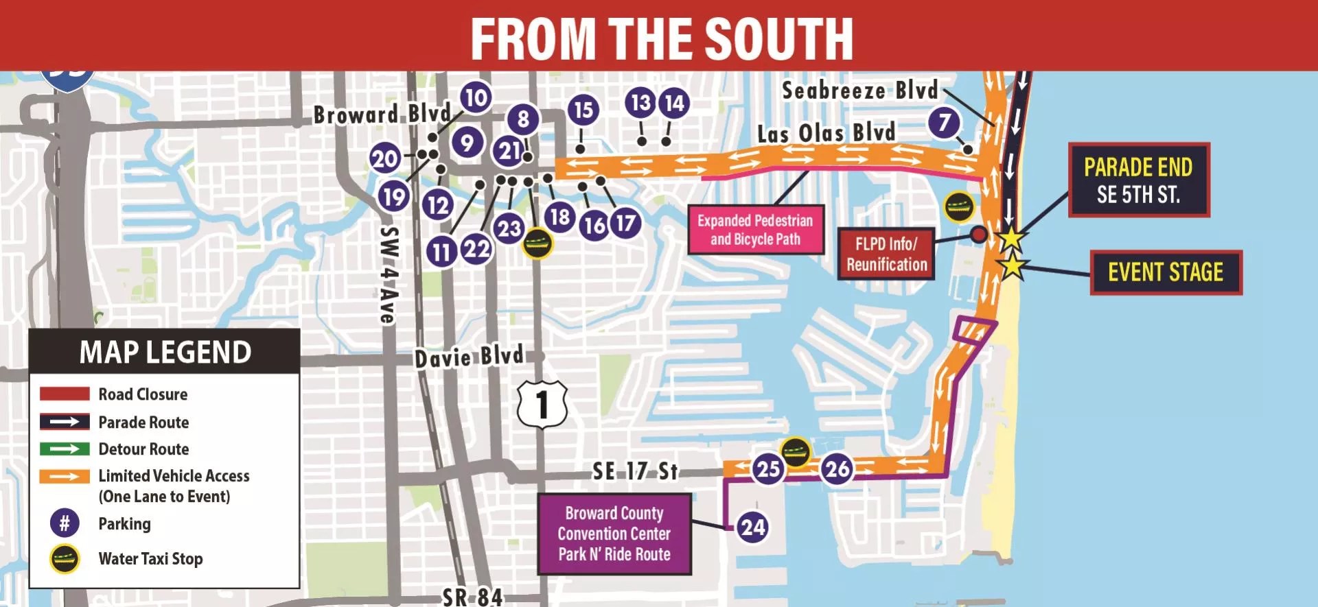 The city advises downtown visitors to expect limited parking and long walks to the event site. To get closer, officials recommend using the water taxi or ride-share services. Broward County Transit will offer continuous loop service to the event site from 8 a.m. to noon, and then back to parking facilities between 2 and 4:30 p.m.