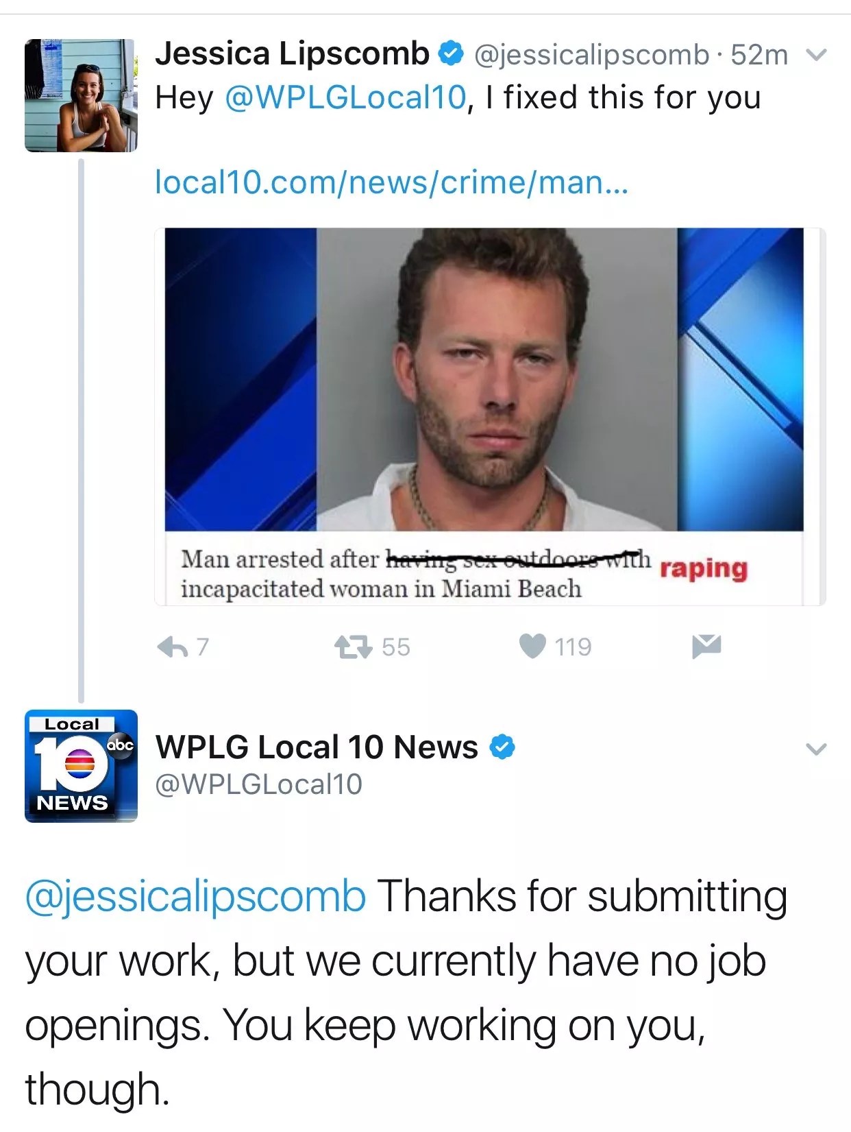 That’s pretty much exactly what WPLG Local 10’s Twitter account did today. The station’s official account launched a petty fight against New Times staff writer Jessica Lipscomb simply because she asked the station to fix a headline so it correctly called an accused rapist an accused rapist.