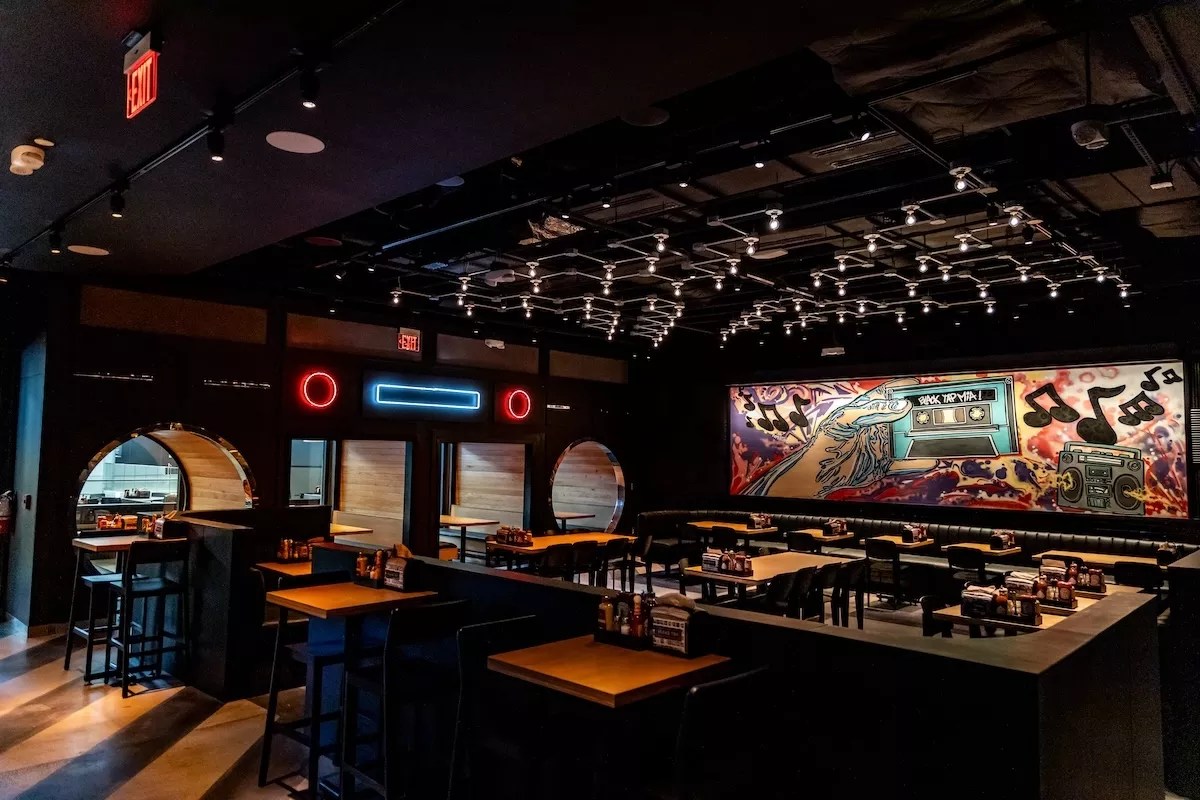 The restaurant features a dimly lit indoor dining room and an outdoor patio that seats up to 200 people. Plus, there’s a 20-seat bar, a takeout window, a signature “Boombox Booth” (a booth located inside of a giant boombox), and other cool areas to munch down in.
