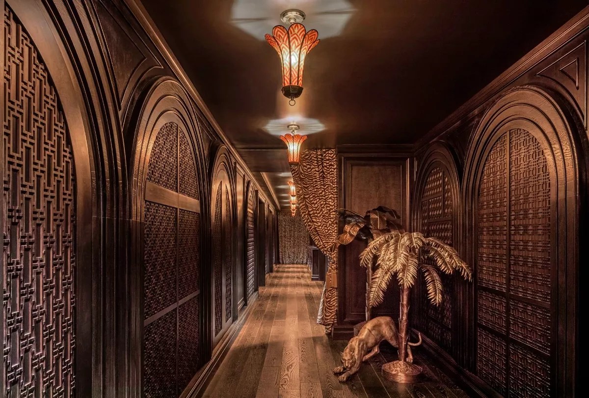 Upon entering, guests approach the Jungle Bar, decorated with gold-leaf ceilings, leopard-print bar stools, and banana-leaf lighting pendants. Get there a bit before your dinner reservation to sip down a martini before entering a long, dark, gilt corridor where a friendly leopard lounging under a gold palm tree will help you find your way to the dining room.