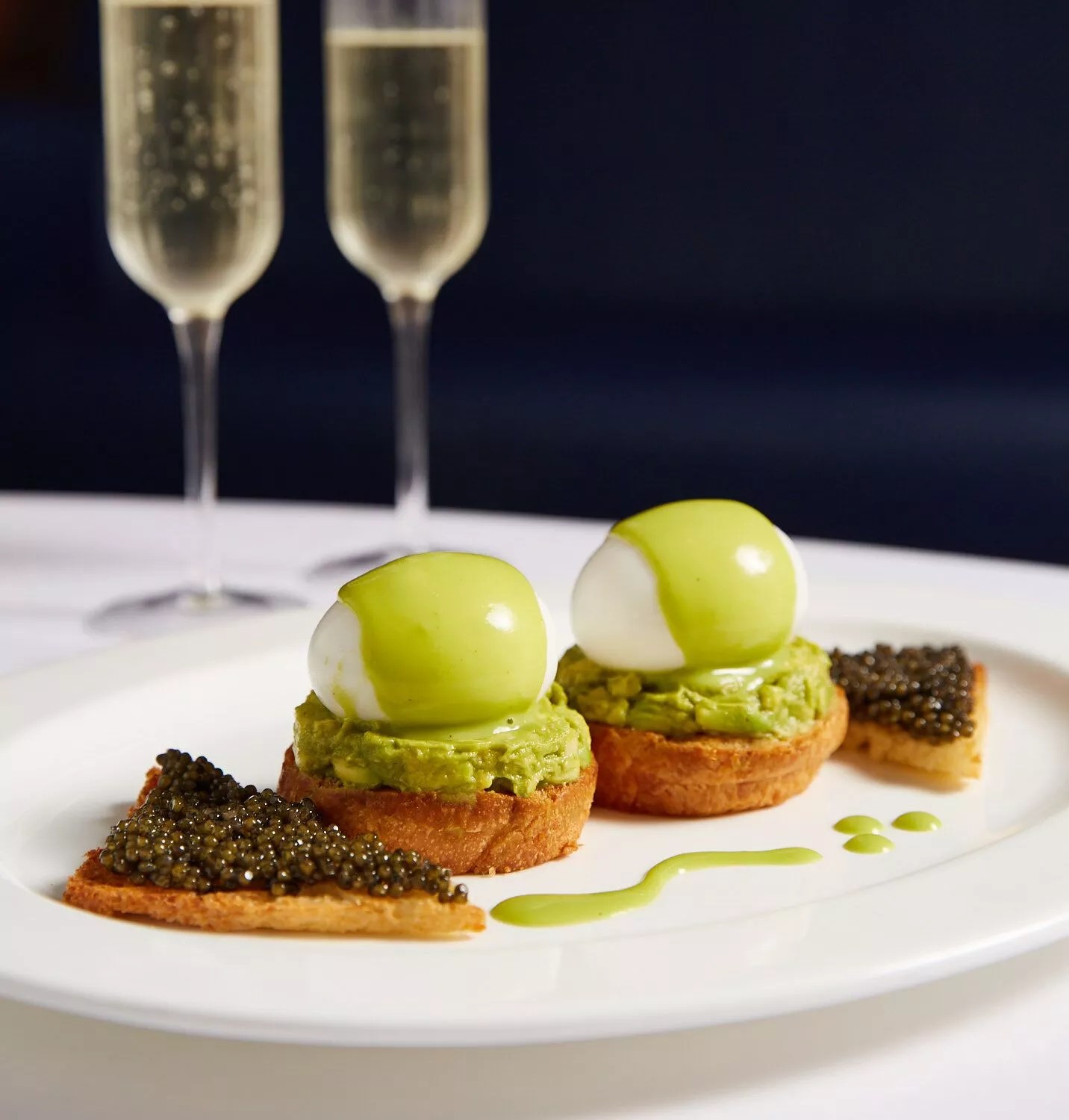 Entrées include a whole butter-braised lobster Benedict, which is served with enough meat to fill two diners; avocado and caviar toast topped with slow-cooked eggs; and steak and egg bernaise, which includes a petite filet mignon and crisp potato pancakes.