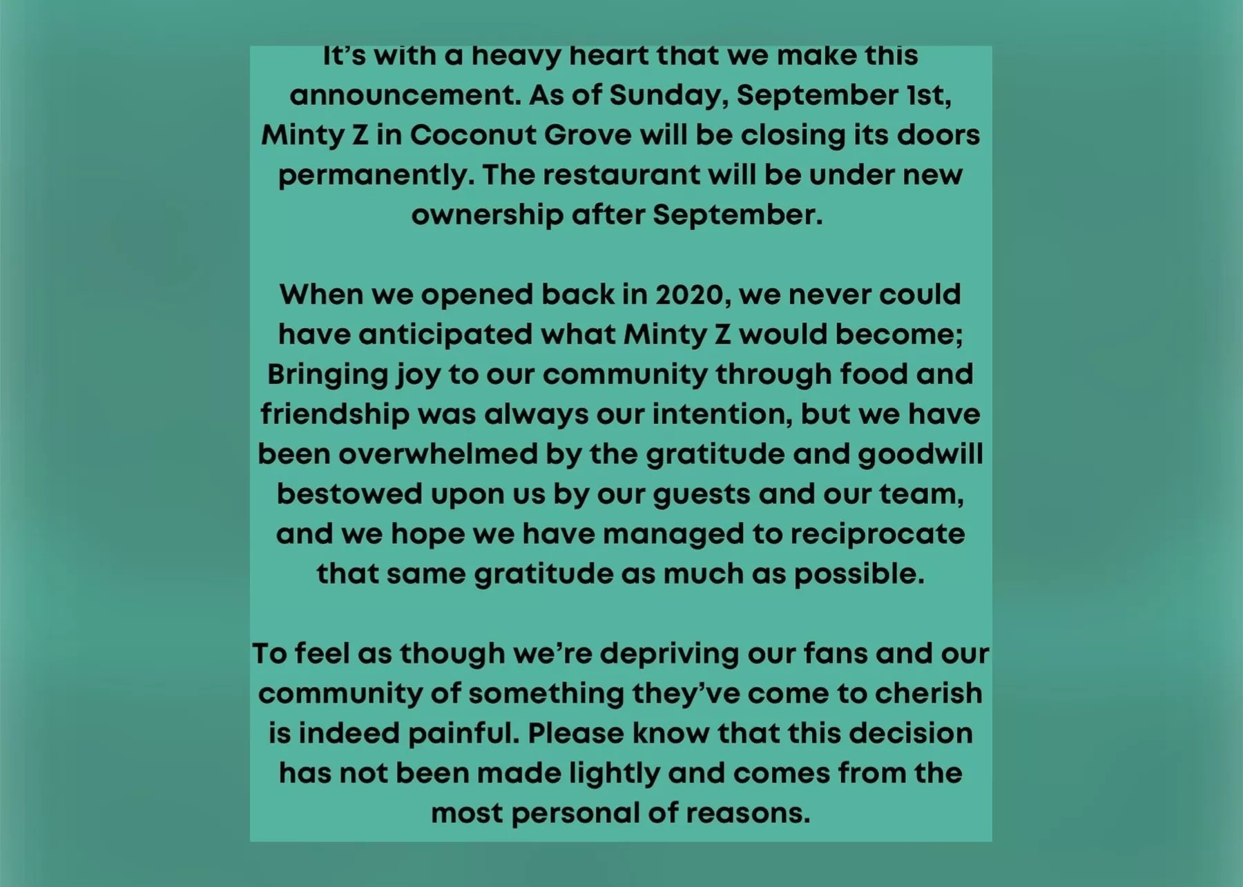 The joint statement, written by Minty Z’s team and owner Alex Falco, reads in part, “It’s with a heavy heart that we make this announcement. As of Sunday, September 1, Minty Z in Coconut Grove will be closing its doors permanently. The restaurant will be under new ownership after September.”