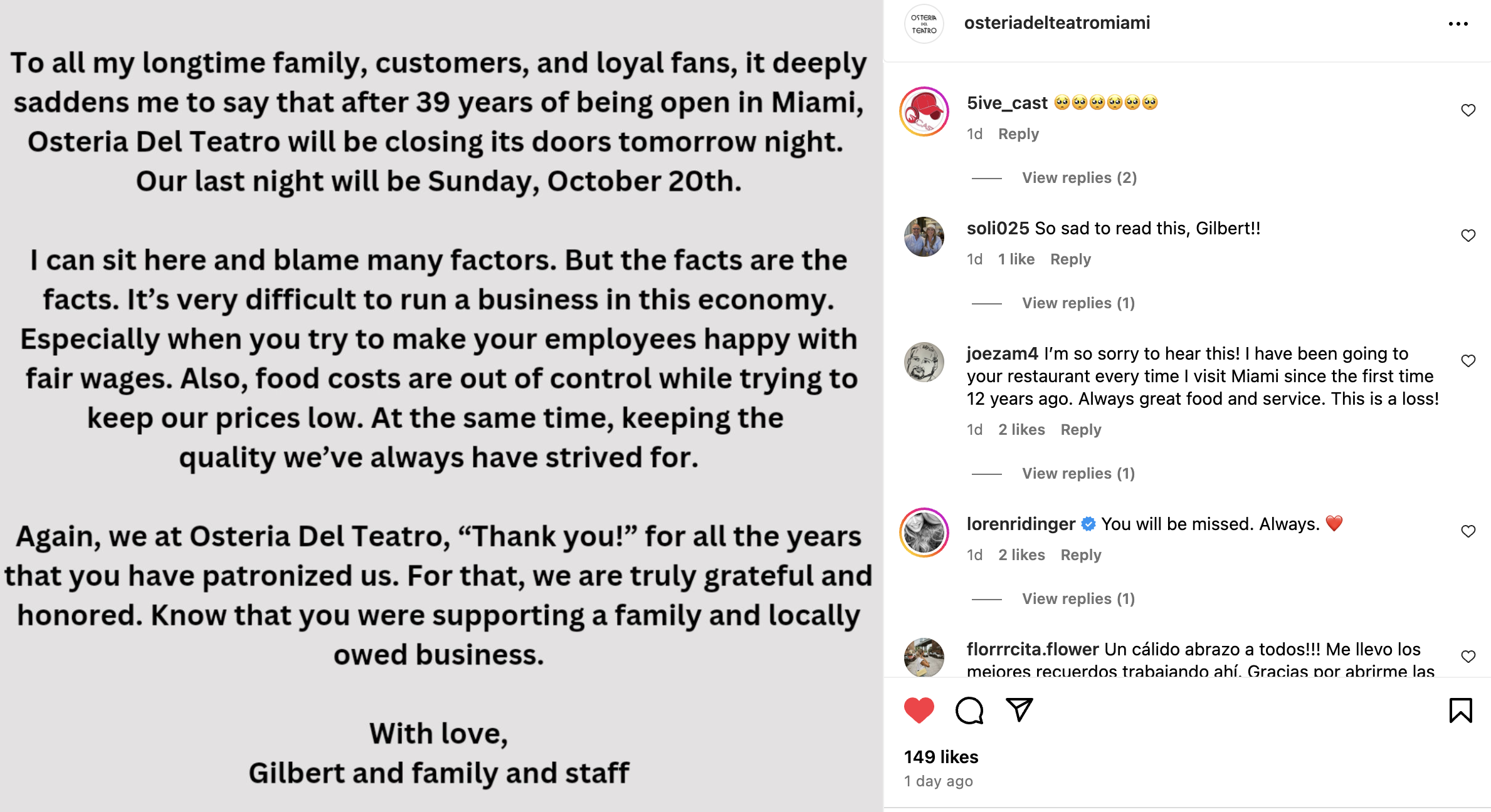 Longtime patrons immediately took the comments on Instagram to express their shock and sadness over the news. One customer wrote, “I’m so sorry to hear this! I have been going to your restaurant every time I visit Miami since the first time 12 years ago. Always great food and service. This is a loss!” while another commented, “Oh, this hurts my heart, Gilbert. You’re amazing, and you did what you could. Big hugs, on to the next adventure.”