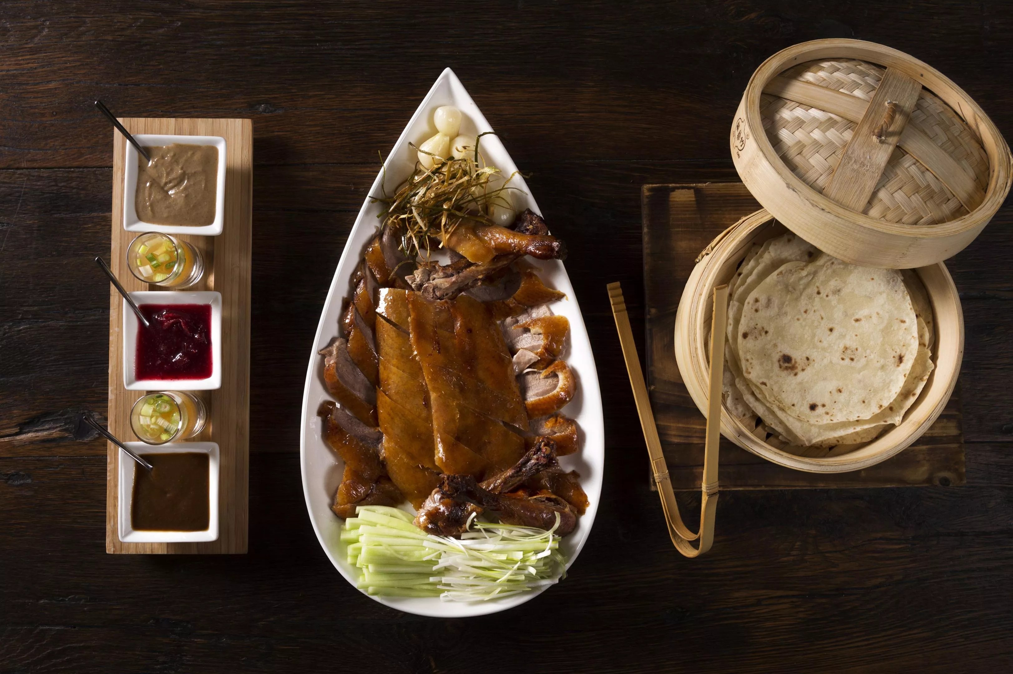 At the restaurant, RedFarm’s corporate chef, Joe Ng, puts his spin on the dish by employing traditional Hong Kong preparation techniques instead of the classic methods from Beijing. Using pumped air, the duck skin is first separated from the fat. The duck is then seasoned and roasted in a vertical, round, gas-fired oven, with ducks arranged around a flame in the middle in a circle until the skin is crisp and golden.
