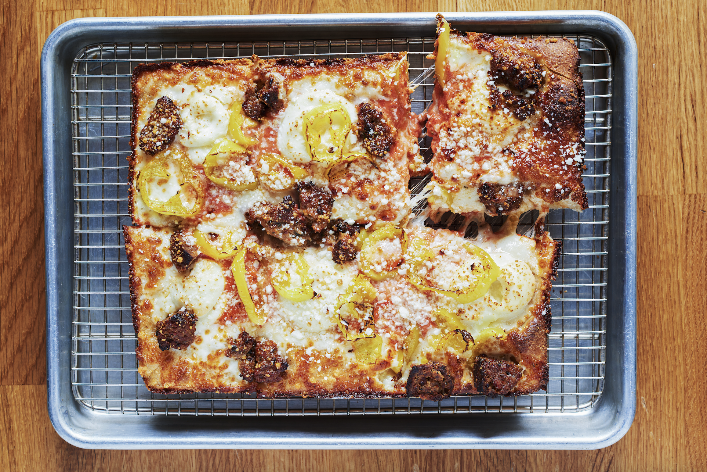 The “Big Ang” pizza from Emmy Squared is covered in unique toppings.