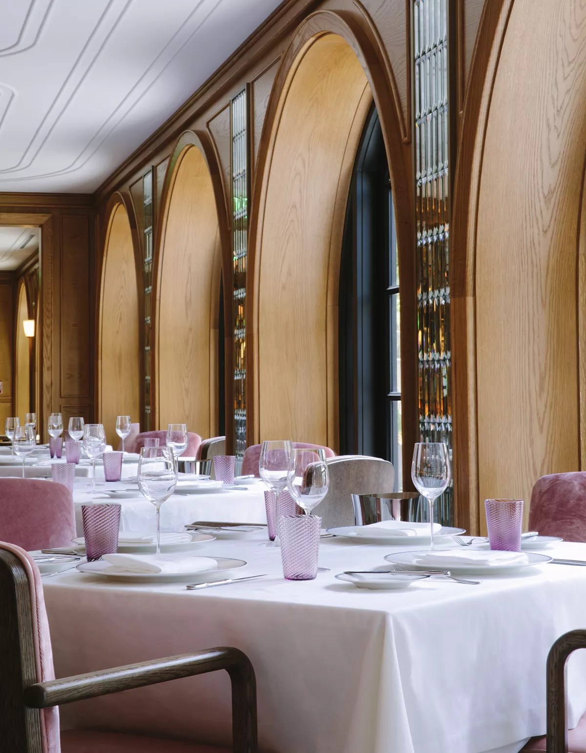 To enter the restaurant, diners must walk through a dimly lit room anchored by a large bar. At several couches and low tables, patrons can order from a less expensive menu of bar snacks and enjoy live music. Continue to the intimate dining room, which overlooks a relaxed patio. The decor – turquoise- and rose-colored velvet chairs, dark wood furnishings, and white tablecloths – evokes old-time glamour and wealth.
