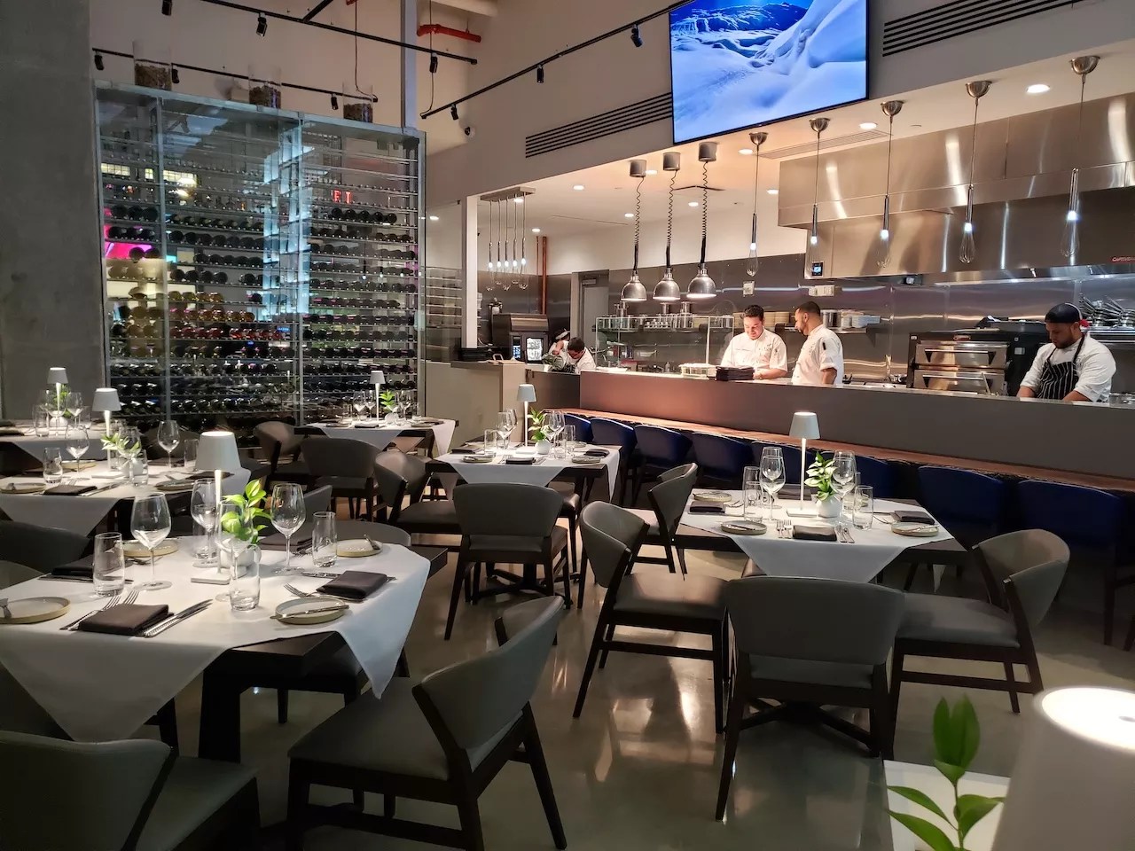 The family’s enthusiasm is reflected in the high-ceilinged dining room, decorated in earth tones with accents of royal blue and art pieces on loan from the Nader Art Museum. The space also houses an eight-seat bar and chef’s table that face the open kitchen. Allowing for social distancing, the covered terrace can accommodate more than 50 additional guests.