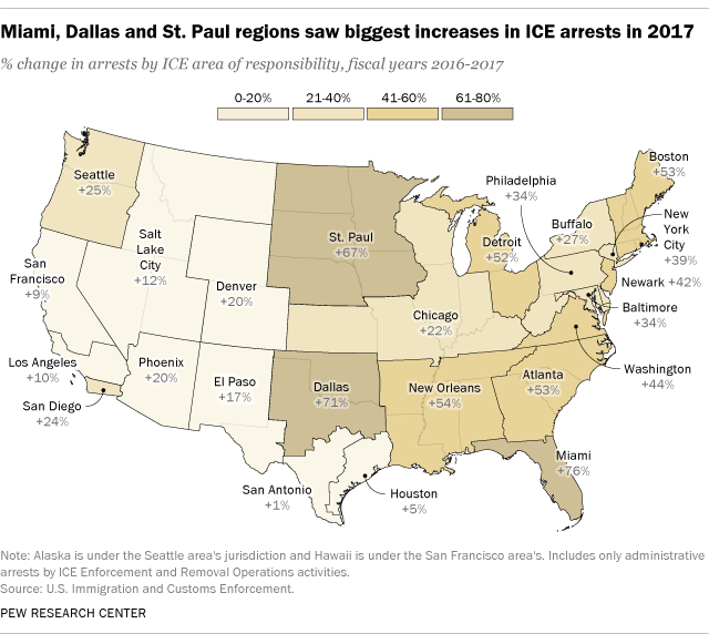 “After years of decline, the number of arrests made by U.S. Immigration and Customs Enforcement (ICE) climbed to a three-year high in fiscal 2017, according to data from the agency,” Pew wrote today. “The biggest percentage increases were in Florida, northern Texas and Oklahoma.”